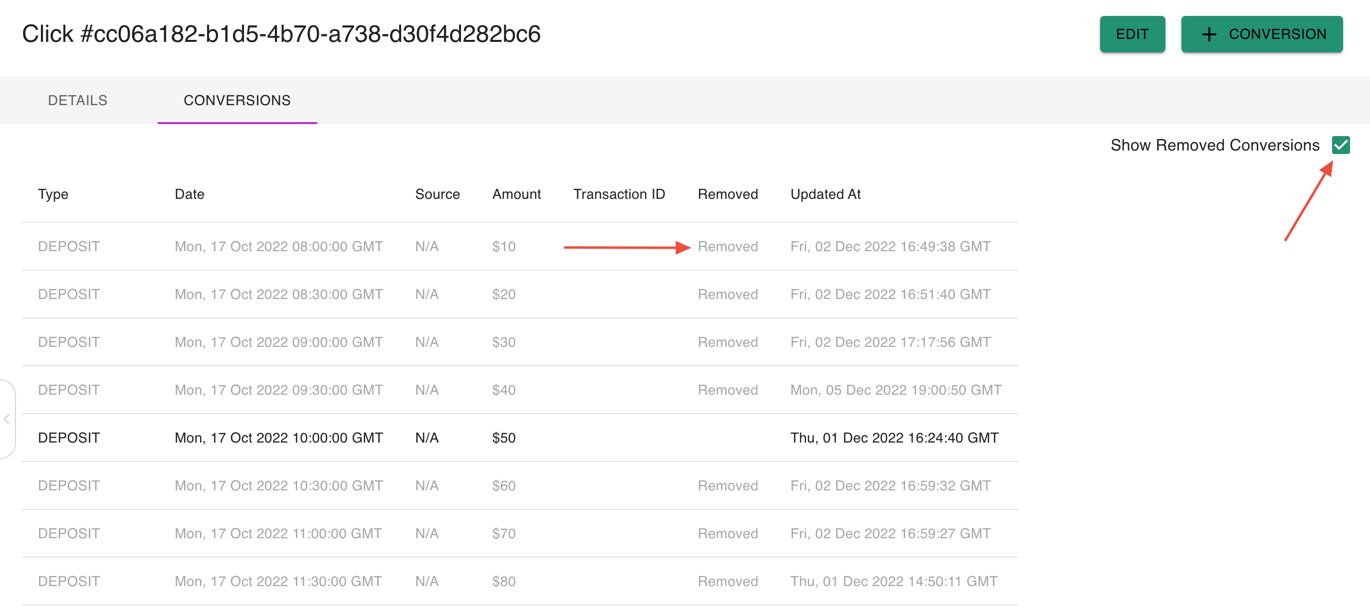 - To view any conversions that have been removed check "Show Removed Conversions", removed conversions will be marked as removed and greyed out.