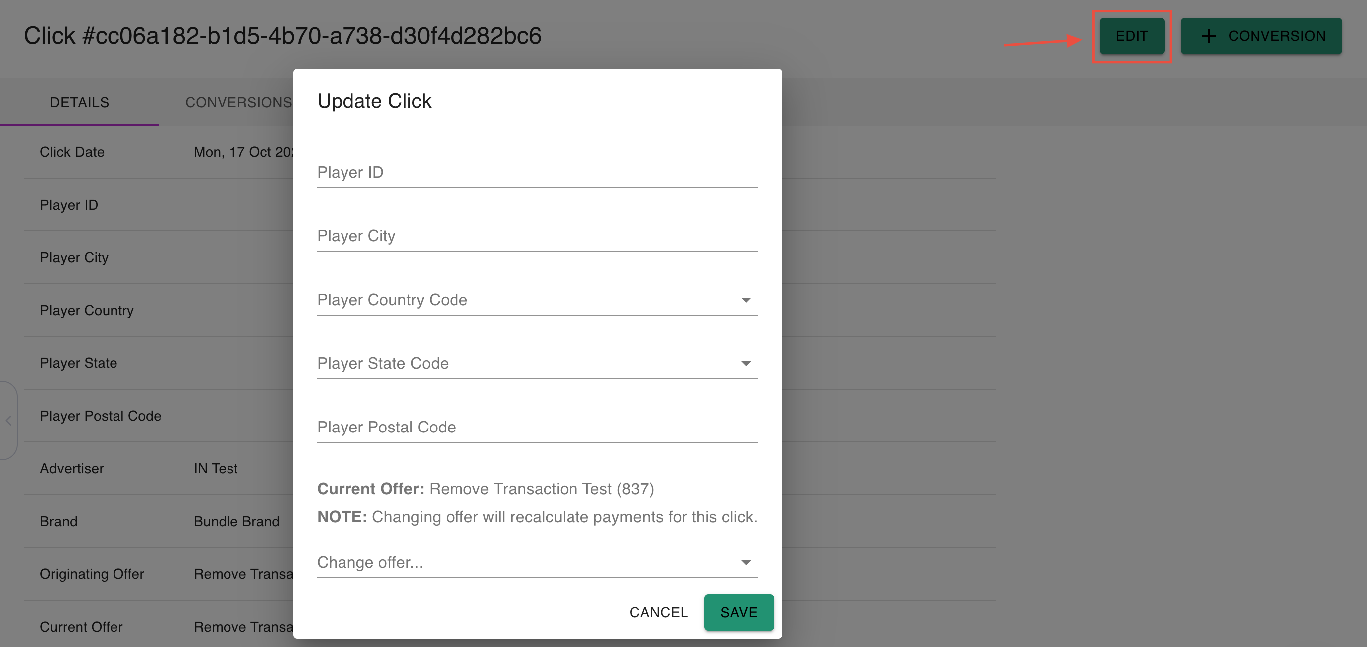 - If you would like to update a click and move it from its current Offer to another, add geo specific data or add a player ID select the "Edit" button. Once the desired update is made hit "save" to confirm the changes.