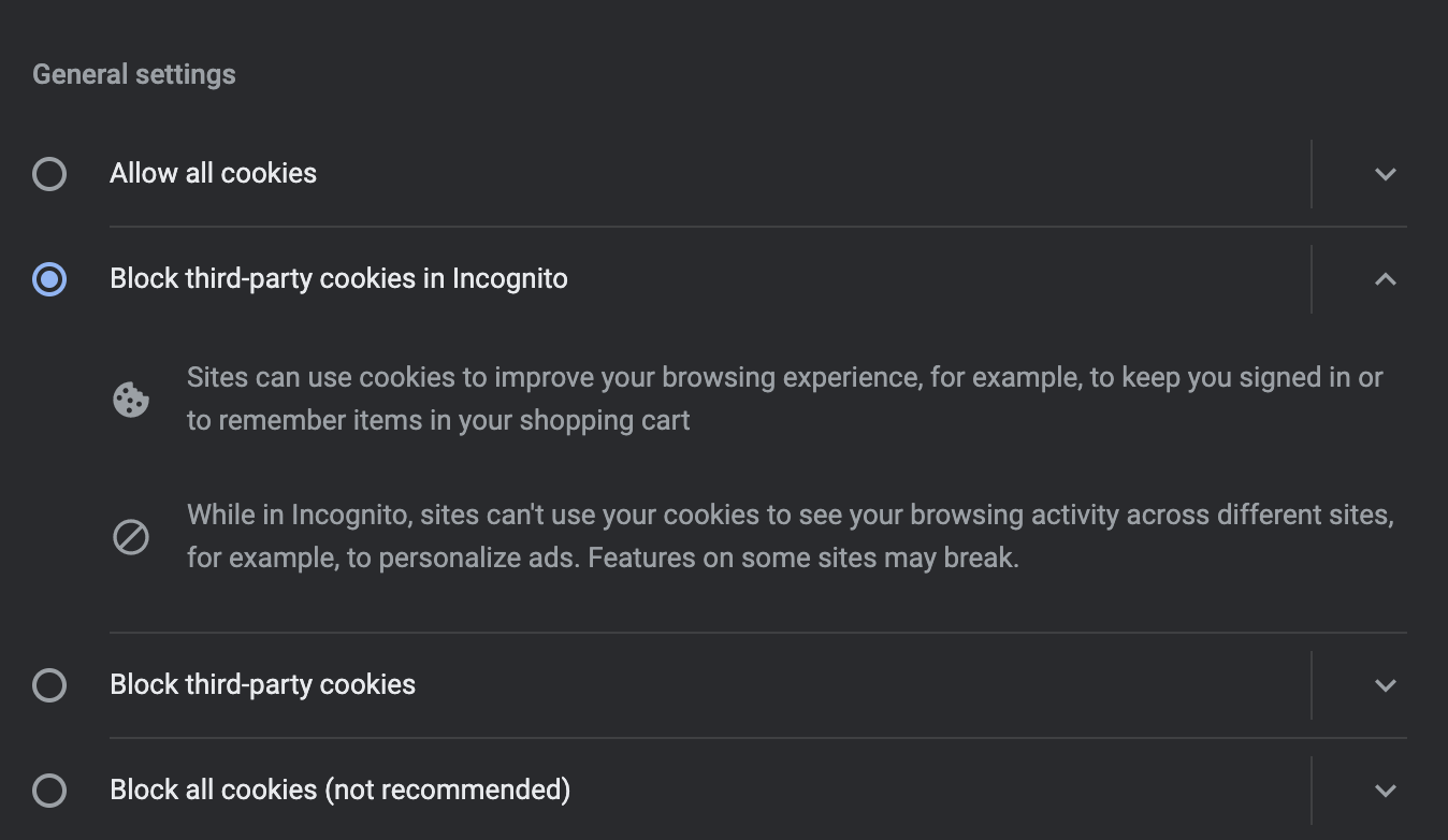 In Chrome choose "Block third-party cookies in Incognito" to at least utilize third-party cookies in normal browsing. If you want to use Intelitics in incognito, you will need to select "Allow all cookies."